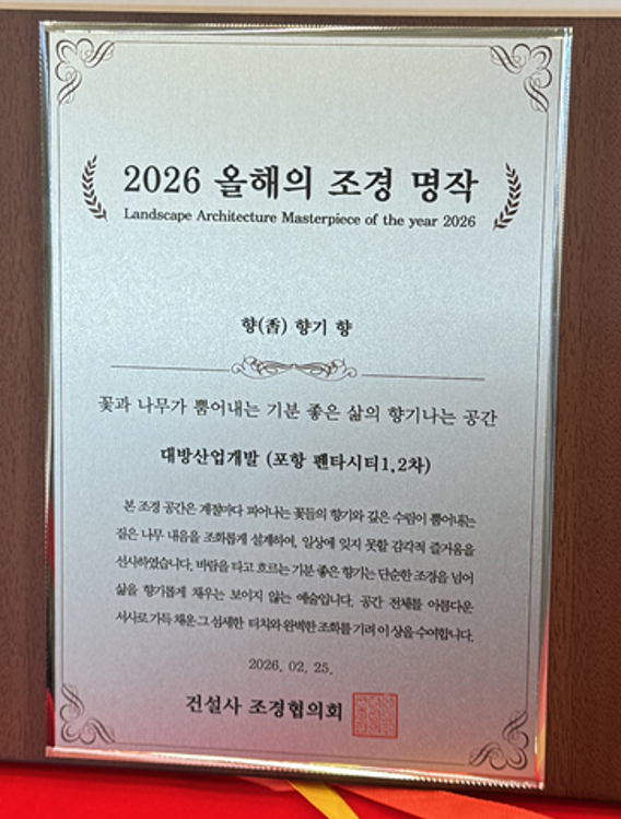 이번 시상식에서 당사의 ‘포항 펜타시티 1·2차’ 조경 공간은 ⟨향기 향⟩ 상을 수상했습니다.
